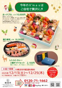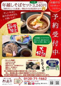 2025.11.25 【年末年始特別メニュー予約開始!!】 お知らせ クリスマス、年越しそば、年末年始限定メニューの予約がスタート!!毎年売り切れてしまうほどの人気なので、ご予約はお早めに。ご予約はフリーダイヤルで0120-71-1662 前のページへ戻る